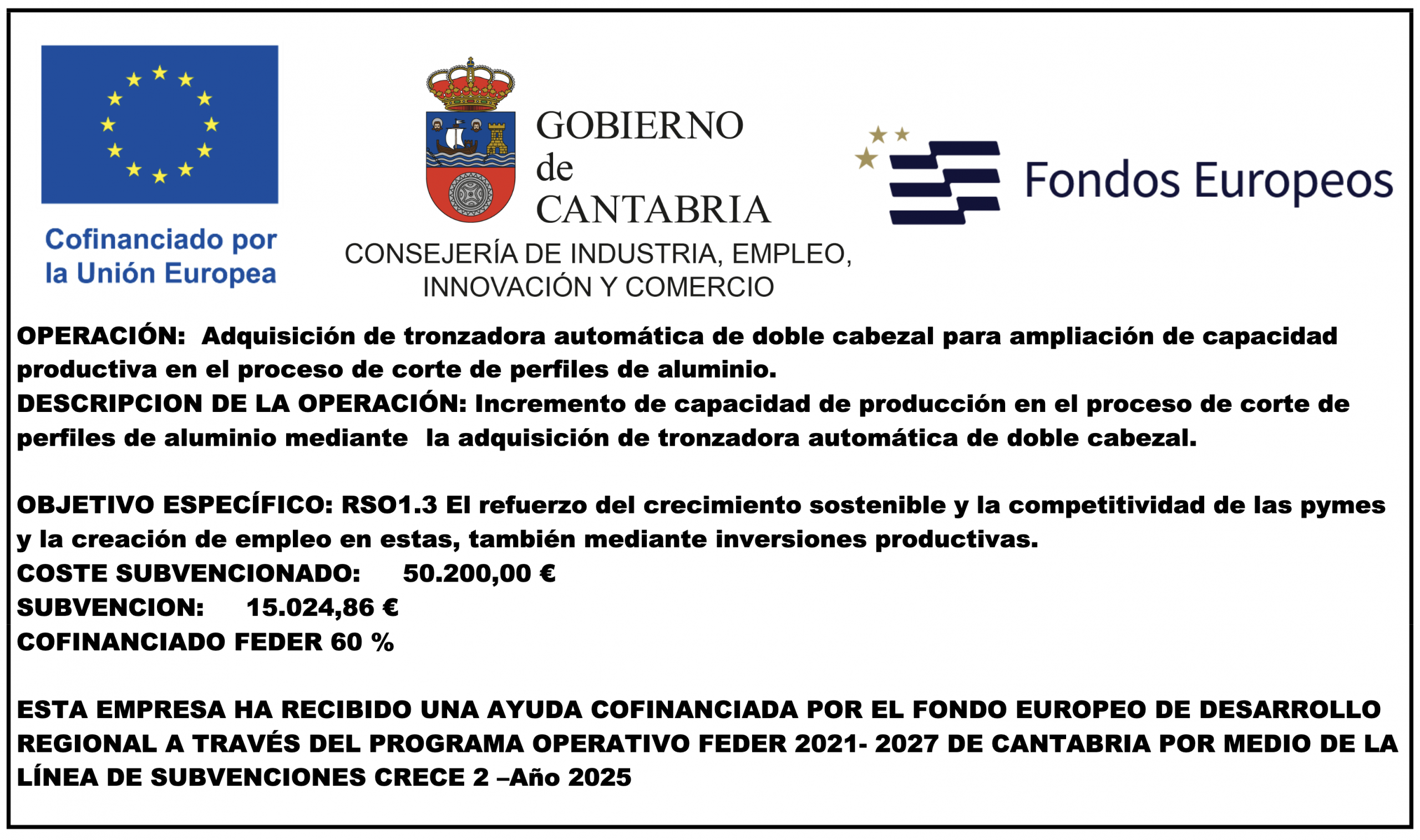 DESCRIPCION DE LA OPERACIÓN: Incremento de capacidad de producción en el proceso de corte de perfiles de aluminio mediante la adquisición de tronzadora automática de doble cabezal.